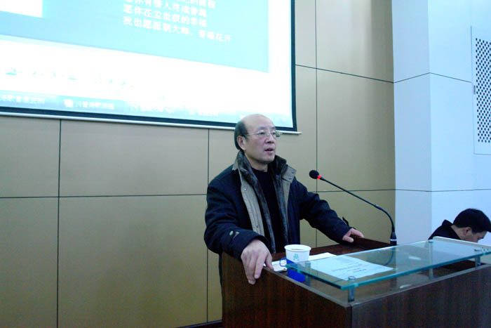 2009年11月19日下午3:30,由教务处主办、新都校区管委会协办、戏剧影视文学系承办的《现代新诗创作与鉴赏》讲座于新都校区图书馆学术报告厅举行。应邀莅临本次讲座演讲的干天全教授是四川大学文学与新闻学院教授,硕士生导师,四川省写作学会常务副会长,当代诗人。现已出版诗集《梨花纷飞》,《无巢的树》等,寓言集《天全寓言》以及专著《鲁迅》等众多作品。 干教授以诗的涵义作为切入点,讲述了现代诗歌创作的艺术想象及其主要特点,诗歌意象的运用,诗歌话语的特质与形态。通过海子的《面朝大海 春暖花开》中现实与理想的结合、干天全教授原创诗歌《中国桃花》中的民族精神及西川的《橡树》中的精神家园让我们感受了诗歌意象的表现性和诗歌内在的韵律。将艺术想象的跨越时空、自由自在和标新立异展现得淋漓尽致。同时我们从诗人托物寓情的表达方法中体味了诗歌的内涵。 前来聆听讲座的有戏文系师生两百多人,也有其他院系热爱诗歌的同学们。会场上始终鸦雀无声,大家静静地品味干教授带给我们的诗意感受,沉浸在诗的意境中。 此次讲座提升了同学们对诗歌的认识,使大家学习了现代新诗的创作方法,提高了鉴赏能力,加深了对现代诗歌的印象,讲座受到广大师生的好评。