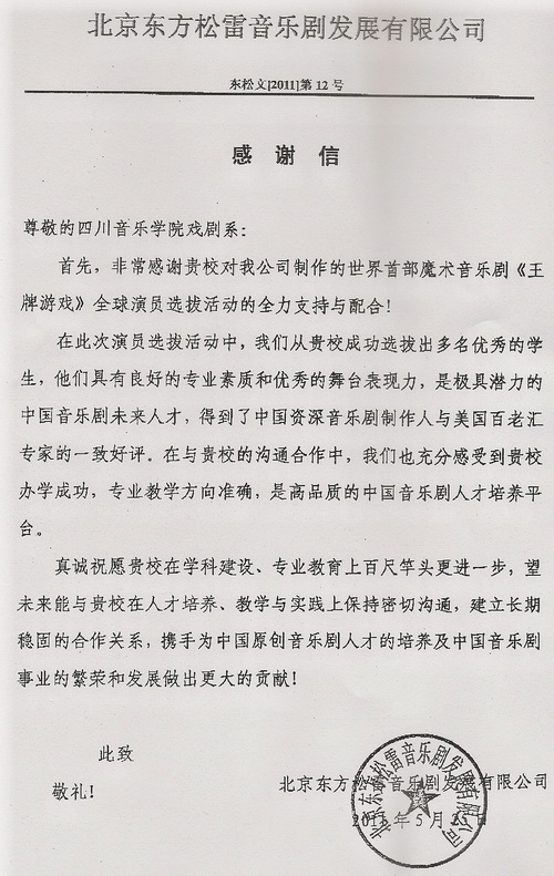 5月25日,我系收到北京东方松雷剧团的感谢信,感谢我系对其制作的世界首部魔术音乐剧《王牌游戏》全球演员选拔活动的支持与配合。