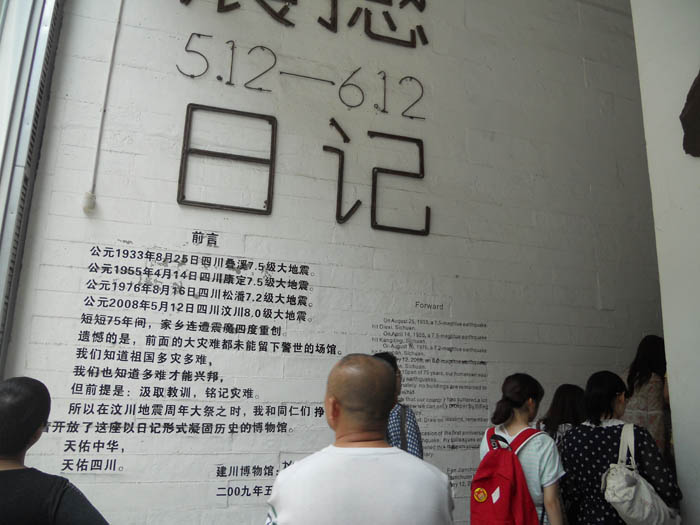 接着大家来到了5•12抗震救灾纪念馆。此馆分成三个部分包括:震撼5•12—6•12日记、地震美术作品馆、地震科普馆。进入馆内,每一位同学都自觉地安静了下来,好像生怕惊动了地震中不幸遇难的灵魂。2008年是那么特殊的一年,一个损坏的挂钟永远定格在了14时28分。那段记忆也被封存,然而对于国殇,人们的悲痛之情却丝毫封存不下来。过去快四年的时间,当大家又如真实般体验了这样一场地震的时候,沉重的心情已经毫不动声色得爬上了同学们的脸庞:废墟中拿铅笔的小手,孩子脖子上脏了的红领巾,手机里妈妈对孩子的留言——孩子,请记得,妈妈,爱你!对于这样一位幸运的孩子来说,母亲给了他第二次生命。还有已经长到三百斤的“猪坚强”,生命的意义,存在于此,历史的记录,让我们深思!