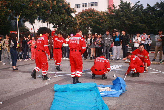 最后,在消防队员和我系教师的带领下,消防队员与同学们来到喷泉广场进行帐篷的搭建活动。在消防队员的示范下,同学们积极参与到搭建活动中。
