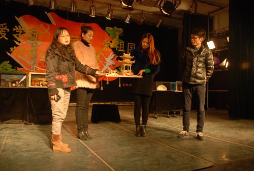 2013年12月10日,戏剧系“三爱”主题师生互动交流会在四教404小剧场举行。晚会由戏剧系党总支主办,戏剧系团总支协办,旨在弘扬“爱学习、爱劳动、爱祖国”的“三爱”精神,表现我系师生积极向上、阳光青春团结和谐的精神风貌。我系王书记、敖主任等党员教师和专业老师及我系学子欢聚一堂,参加了本次活动。 晚会以“爱学习、爱劳动、爱祖国”为主题,内容形式多样,丰富多彩。有“青春歌舞表演”、“配乐散文朗诵”、“服装现场制作”、“舞美手工作品”、“幽默哑剧”这五个内容的交流。 音乐剧同学表演的青春歌舞和配乐散文朗诵,声情并茂,感人肺腑;服装与化妆设计专业同学和专业教师老师同时上台,展示了自己的专业特色,让戏剧师生拍手叫绝;舞台美术设计专业老师将同学们的优秀手工作品带上舞台,详细的介绍了舞台美术的精髓所在,让同学们对舞美有了更深的了解;最后,服装化妆专业的曹老师带领非表演专业的同学表演的自创、自编、自导、的幽默哑剧“抓舌头”,将整场晚会的气氛推向高潮。演出博得了一阵又一阵的热烈的掌声,台上台下欢乐一片。 戏剧系“三爱”主题师生互动交流会,充分体现了师生们对祖国、对校园、对专业的热爱,以及我系师生积极向上、阳光青春、团结和谐的精神风貌。