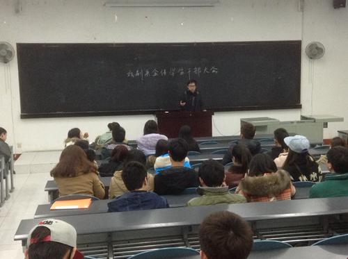2014年3月6日晚6时,戏剧系全体学生干部大会在一教120教室召开,参加此次会议的老师有党总支副书记谢东江和团总支书记敬程,会议由敬程主持。