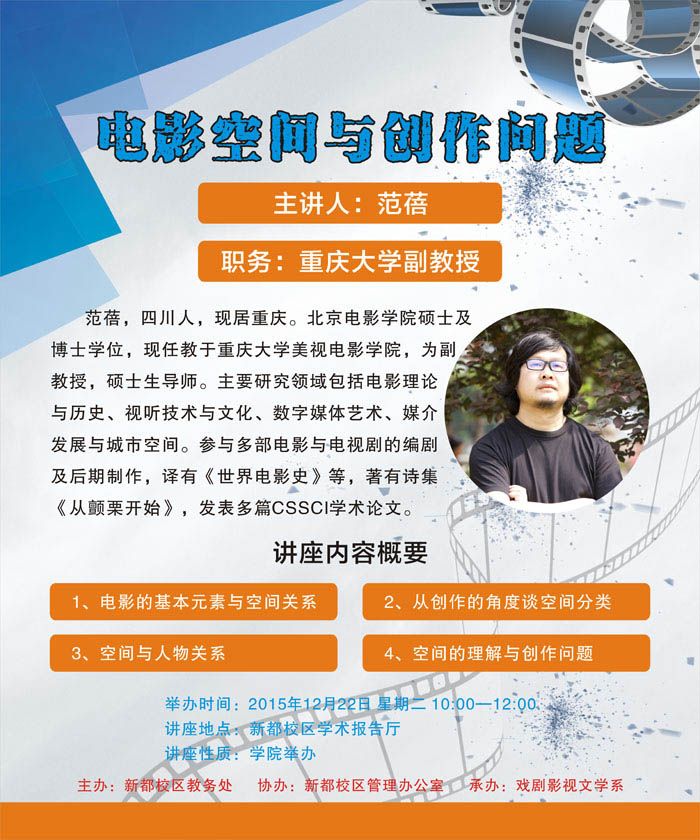 2015年12月22日上午10点,重庆大学副教授范蓓先生在图书馆学术报告厅举办主题为《电影空间与创作理解》的学术讲座。我相关专业老师出席此次讲座,2015级同学认真聆听并学习相关知识。 范蓓教授获得北京电影学院硕士及博士学位,现任教于重庆大学美视电影学院。讲座现场学术氛围浓厚,范蓓教授为学生们详细介绍电影创作过程。主要围绕“电影的基本元素与空间关系”,“从创作的角度谈空间分类”,“空间与人物关系”和“空间的理解与创作问题”四个方面对电影和剧本进行解读,传授知识的过程中也与同学们亲切地互动交流。 此次讲座开阔了我系学生的视野,让同学们对电影剧本创作有更深刻的了解,也给我系学生学习专业知识提供平台。