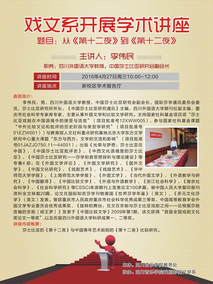 2016年4月27日星期三上午十点,我系邀请四川外国语大学教授、中国莎士比亚研究会副会长李伟民教授来我院新校区学术报告厅举行了以“莎士比亚与《第十二夜》”为主题的学术讲座。我系副主任左芝兰副教授主持此次讲座。 李伟民教授以今年是文学巨匠莎士比亚逝世四百周年纪念日为引展开讲座内容。首先他简单介绍了莎士比亚的生平、写作风格及时代背景。他提到:在叙事风格方面,莎士比亚擅用多条线索齐头并进的叙事方式。其次,他简述了《第十二夜》的内容即其在当今具有的文学价值。随后,他讲解了莎士比亚一生的创作历程,从早期充满理想化色彩的浪漫喜剧到被认为是其创作高峰的《第十二夜》转入后期的悲剧创作,这其中也反映了莎士比亚一生坎坷的命运历程。最后,李伟民教授亲切地与现场同学互动,并就东西方文化的差异与传播展开交流。 此次学术讲座完满结束,我系同学收获良多。深入了解文学大师及其时代背景,不仅有利于深入了解历史人物,更有利于加深我们对文学作品的理解。