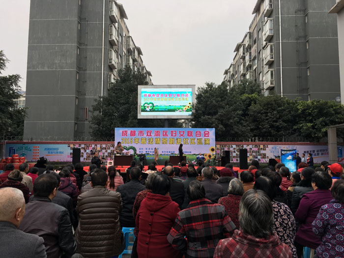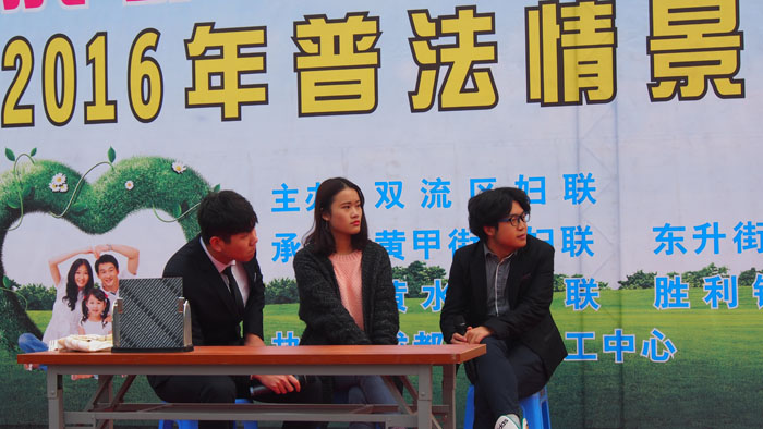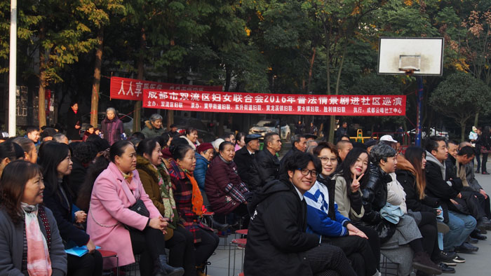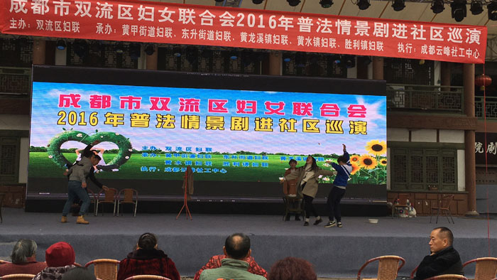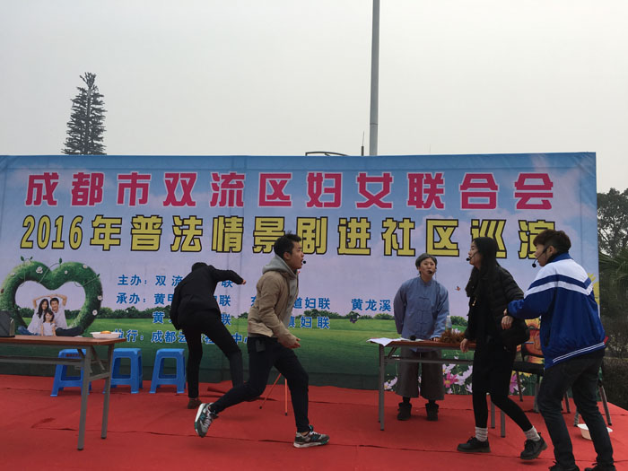 日前,双流区妇联2016年普法情景剧进社区巡演活动在东升街道普贤社区的文化广举行。 活动现场,普贤社区数百位社区居民一起观看了由伟德bv国际体育戏剧影视文学系学生创作排演的反家暴主题情景剧《贾德故事》。催人泪下的故事情节,演员们精彩的演出,赢得了现场观众阵阵热烈的掌声。 该情景剧为戏文系学生习作,由我系副系主任左芝兰副教授全程指导。从剧本创作、表导演编排、舞美道具制作全部由我系学生独立完成。此次巡演,旨在积极向基层群众进行法制宣讲,促进和谐友爱家庭建设。接下来,普法巡演还将陆续在东升街道、黄甲街道、黄龙溪镇等街道、乡镇上演。