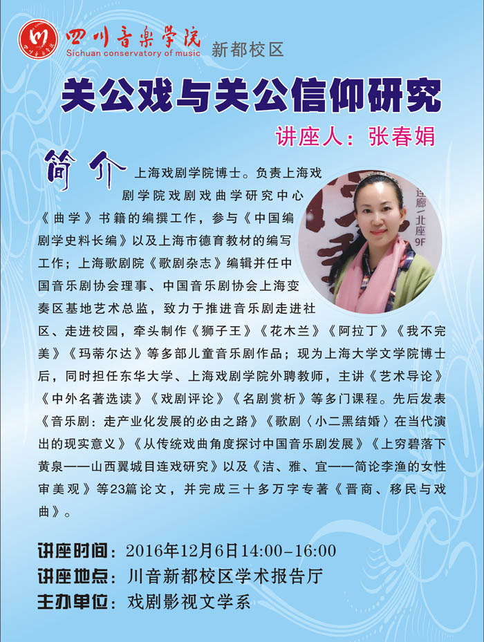 2016年12月6日下午2点,我系邀请上海戏剧学院的张春娟教授在图书馆学术报告厅开展学术讲座。戏文系主任左芝兰副教授,我系相关专业教师以及我系15、16级学生聆听了此次讲座。 张春娟教授的讲座主题是《关公戏与关公信仰研究》,她从历史古籍中的关羽入手,结合《三国演义》中的历史事件及民间传说,给同学深入浅出的诠释了一个忠义仁勇的关公形象并讲解了关公戏的表演规矩、关公信仰的研究等问题,将关公、关公戏、关公信仰三者关系紧密的结合了起来。 讲座的最后,教授和同学们进行了互动交流,为同学们解答疑惑。 拓宽我系学生的专业视野,为学生打下戏剧戏曲剧本写作表演基础,提升了学生对本专业的认识,是一次难得而宝贵的学习机会。