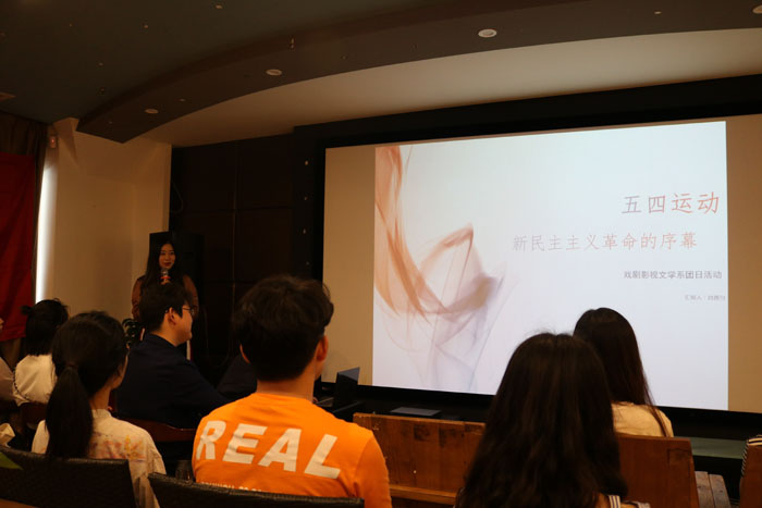此次活动,由系学生会主席赵金同学领誓,全体团员以重温入团誓词的方式拉开团日活动的帷幕。随后,我系2016级团员代表肖茜匀同学以PPT演说的形式带大家回到了1919年5月4日,讲述了五四运动的前期筹备,文明新时代,以及运动的后续事情。让大家更加深入地了解到五四青年节对当代青年人,尤其是对大学生的重大意义。之后共同观看了电影《厉害了,我的国》。