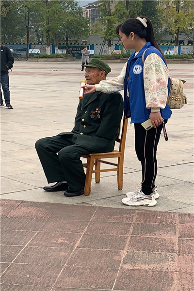 活动于广元红星公园中进行。首先,现场聆听了李化武老先生讲述他关于抗战的亲身经历。在抗美援朝战争中李老先生身中炮弹负伤,失去右眼和双手,成为一级残疾,但人生的不幸没有摧垮他坚强不屈的意志,在四川革命伤残军人休养院住了10年后,自愿申请回乡,成家立业,自力更生养活一家人。曾获得“钢铁战士”光荣称号并记二等功。李老先生坦言,当年在战场上,看到美国的飞机坦克,而我军只有小米加步枪,他也感慨当时国家的贫困与落后,但是靠着中国人民志愿军坚韧不拔的意志,中国在先天不足的情况下,取得了胜利。他钢铁般的意志和自强不息的精神深深的打动了在场的同学们。就如同无数人在70年前的这场战役中失去了生命,但他们的精神却永存在我们心中。