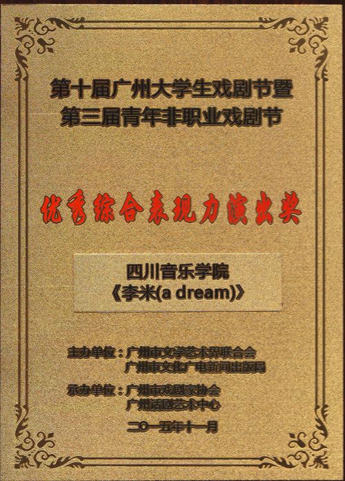 2004年以来,广州大学生戏剧节已经举办了十年,该戏剧节由广州市文学艺术界联合会,广州市文化广电新闻出版局联合主办,由广州市戏剧家协会,广州话剧艺术中心联合承办。此次戏剧节共分为大学生竞演单元和非青年职业戏剧竞演单元,以广州话剧中心U13剧场为竞演舞台,大赛共有54个比赛剧目,竞争十分激烈。在学院的大力支持下,我系选送原创话剧《李米》参赛,编剧、导演为我系青年教师任苑,刘琳琳,演员为13级戏剧影视表演学生黄韵霖、张旭、蒋超良等。经过层层竞技选拔,我系剧目取得了本次戏剧节比赛第二名,获得“优秀综合表现力演出奖” 的好成绩,组委会特邀《李米》参加随后一月的优秀剧目展演。 通过这次的比赛,我系的专业教学在戏剧界有着非常好的影响,广州话剧院团的领导和老师对我们系的教学水平赞赏有加,同时,我系师生也在这次比赛之中观摩了很多高水平的参赛剧目,青年教师学习到了好的教学方法,学生开拓了视野。这次参加广州大学生戏剧节活动,学生受益,也促进了青年老师的成长。