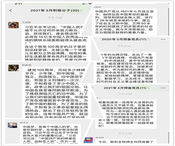 我院学生党员和入党积极分子在收看了直播后也同样热血沸腾,纷纷在我院学生党员和积极分子微信群中发表心中感言。同学们也手拿建党百年标语牌祝贺我党百年华诞。