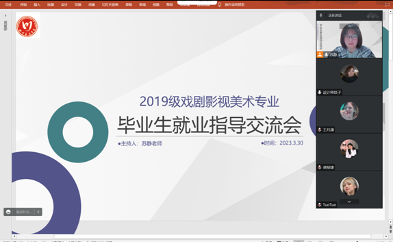 2023年3月30日20:00—21:00,在戏美教研室苏静老师和辅导员吕文歆老师的组织下,开展了一次线上的毕业生就业指导交流会。戏剧学院19级戏美专业两个专业方向(戏剧影视美术设计、戏剧影视服装化妆设计)的毕业班57名学生参会。