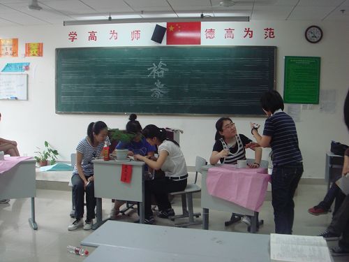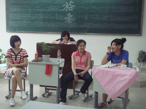 2009年5月25日下午第三节课,新教学楼303高二(2)班教室,在任书苇的主持下,召开了话剧《茶馆》片段表演的主题班会,附中党委书记曹老师和学生科董老师、李老师到会指导。本次活动的目的一方面是丰富班会的内容,使其多样化、趣味化;另一方面是训练学生的语言表达能力;另外也是希望学生通过表演,进一步理解课文,在阅读、鉴赏文学作品时以期尽善尽美。同学们的表演惟妙惟肖,特别是王利发、巡警、刘麻子、老陈的扮演者郑雅方、陈柳吟、姚璞阳、汤晨晨更是形神兼备,得到了大家一致的掌声。最后,班主任董畅老师对这次班会并结合语文课的学习进行了总结:加强了学生之间的默契配合;进一步深化了对语文课文的主旨、表达方式、人物形象、语言特点等的理解与认识;提高了学生的综合表演能力;丰富了班会的形式;带动了学生的学习、表演积极性,促进了个性发展和综合素质的提高。希望以后的班会更加丰富多彩。