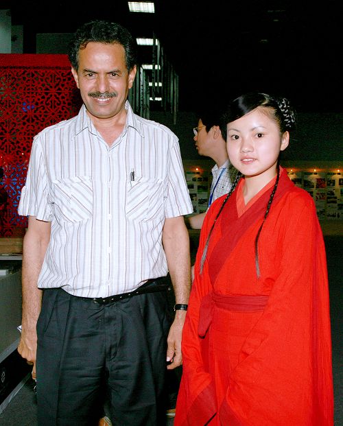 2009.6.1联合国科教文组织非遗委员会主席阿瓦德.阿里.萨勒哈(Awadh Ali Saleh)在第二届中国成都国际非物质文化遗产节,聆听且称赞伟德官网古琴专业学生郭绮雯的演奏,并与其合影留念。(王开友 摄)