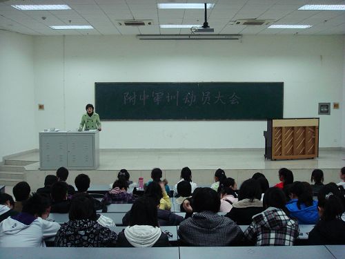 2010年3月4日上午9:00,附中全体高一学生在班主任的带领下在阶梯教室参加了军训动员大会。学生科科长董畅老师代表校领导从军训的目的、意义和要求三方面作了动员,希望大家能一切行动听指挥,顺利完成这门课程。