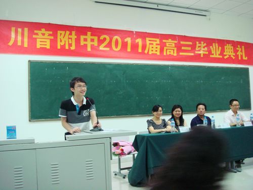 2011年6月10日上午9点整, 川音附中2011届高三毕业典礼在学院阶梯教室隆重举行。典礼在庄严的国歌声中拉开帷幕,出席此次典礼的领导有伟德bv国际体育党委委员、附中校长蔡宇教授、附中副校长唐燕翎副教授、党总支副书记罗祥勇副教授。出席的嘉宾有高三年级的全体科任老师、高三年级部分学生家长,他们共同见证了2011届毕业生几年来在附中生活、学习,全体毕业生顺利毕业了。
