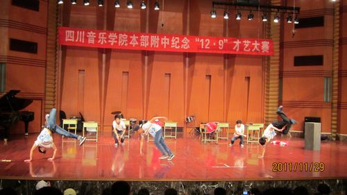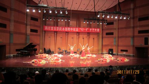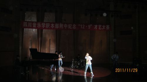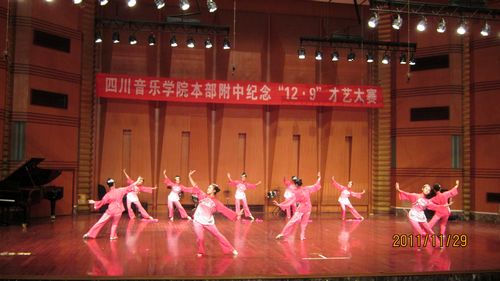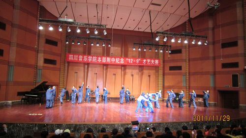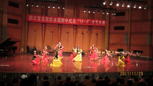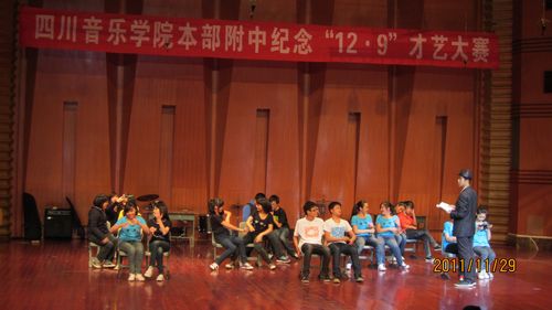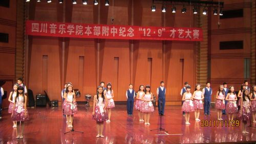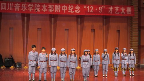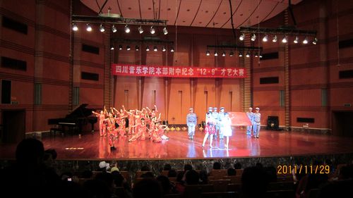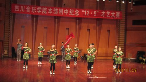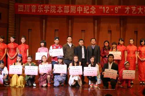 2011年11月29日晚7点半,附中纪念“12•9”才艺大赛在学院大音乐厅隆重举行。学院纪委委员、学工部副部长、学生处副处长、院团委书记李天昊老师,学院党委委员、附中校长蔡宇教授,附中党总支副书记罗祥勇高级讲师,附中副校长唐燕翎高级讲师莅临此次大赛。本次比赛的评委由院内外专家组成。 大赛演出内容丰富,形式多样,富有浓郁的爱国色彩和中学生的青春气息,具有一定的专业水平,充分展现了附中学生的才艺,得到领导和评委的一致好评。大赛临近尾声,评委之一四川省人民艺术剧院艺术家郝晓洪教授,对各班节目作了精彩点评,接着由主持人当场公布分数和名次,领导们上台为获奖班级颁奖并合影留念。晚会再一次掀起高潮,大赛在师生们的欢呼声中圆满结束。 此次大赛各班分获名次: 初中组 一等奖:初三、一班(48.47) 二等奖:初二、一班(47.7) 初二、二班(47.91) 三等奖:初一、一班(46.57)初一、二班(47.52) 初三、二班(47.14) 高中组 一等奖:高二、三班(49.08) 二等奖:高一、二班(48.74) 高二、一班(48.98) 三等奖:高一、一班(48.08) 高一、三班(47.46) 高一、四班(47.87) 高二、二班(47.89)