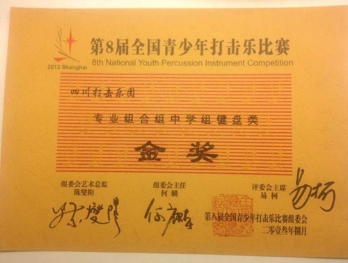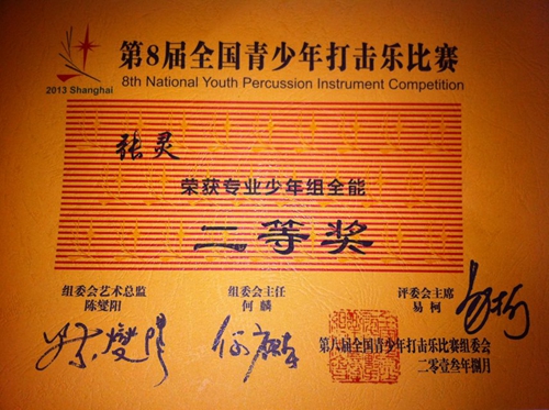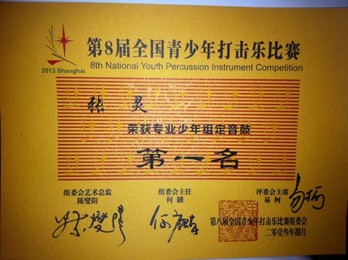 附中初二学生张灵参加全国青少年打击乐比赛获奖