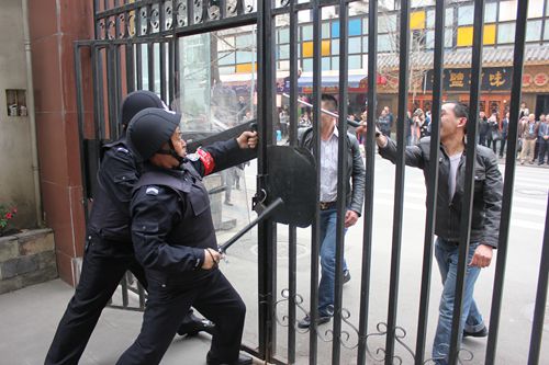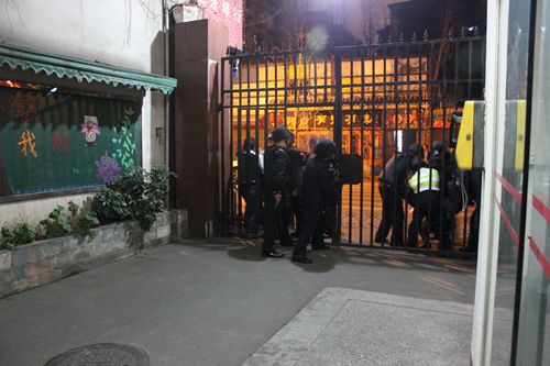 演练信号于当日14:00准时拉响,演练正式启动:附中校门遭到2名“恐怖分子——外来人员持刀”突袭,附中保安发现险情后第一时间作出快速反应,吹响警报哨音的同时,两名保安努力抵抗外来袭击,一名保安第一时间与学院保卫处、望江派出所取得警力支持,并将突发信息马上通报给各楼层生活管理老师,各楼层生活老师迅速做出反应,立即组织学生回到室内,随后关闭楼层宿舍大门,学生立刻将课桌移至宿舍铁门和床之间,让宿舍房间门无法从室外开启,使每间宿舍成为临时的“安全岛”,以防不法分子进入寝室,学生在寝室安静躲避等待警力支持,达到“自我保护”的效果。校门抵抗2名“恐怖分子”的保安在坚持了近3分钟时,得到学院保安队近10名保安的强力支持,在1分钟内保安人员合力制服了“恐怖分子”,与此同时,接获“警情”的望江路派出所也及时赶到, 保安人员把“恐怖分子”移交警方处理。演练圆满结束。
