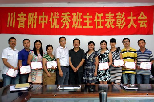2014年9月9日下午,附中全体教师在三楼会议室召开了第四届优秀班主任表彰大会。     班主任工作一直是学校学生教育与管理工作的一项重要内容,为了规范和加强班主任工作的管理,附中开展了优秀班主任评选,本次已经是第四届。一年来,班主任积极主动地开展工作,切实做到了教书育人,为人师表,在班级管理工作中关爱学生,及时了解学生思想动态,形成了健康、和谐、积极向上的优良班风,为学生学习、生活创造良好的条件。此次评选通过“班主任工作学校评定表”、“班主任工作自评表”、“班级情况教师调查表”、“班级情况学生调查表”、“文明班级”等的总评统计,选出了8位热爱学生工作的优秀班主任。表彰会上,蔡宇校长宣读了学校的表彰决定并颁发了荣誉证书。   优秀班主任名单如下: 薛莉萍 吴 奎 柴 容 董 畅 王春燕  刘天赋 舒云波 何云洪  向获奖的班主任表示祝贺!