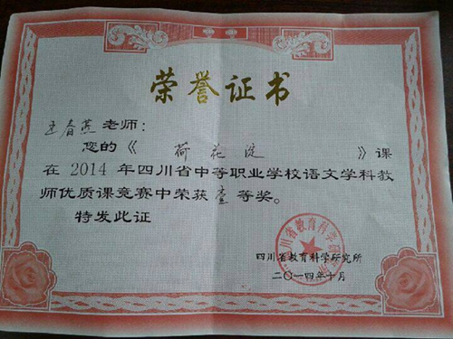喜报3——附中文化课教师王春燕老师喜获四川省教科所教学比赛一等奖