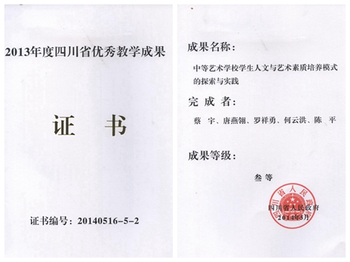 2014年6月,附中“中等艺术学校学生人文与艺术素质培养模式的探索与实践成果” (蔡宇、唐燕翎、罗祥勇、何云洪、陈平),获2013年度四川省人民政府普通教育优秀教学成果三等奖。