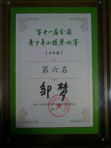 初二一班邹梦同学于2015年11月8日在青岛举行的“全国青少年小提琴比赛”中获得第六名。指导教师:李开祥