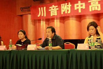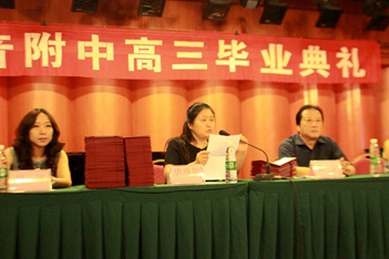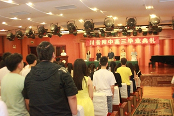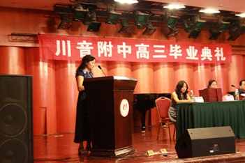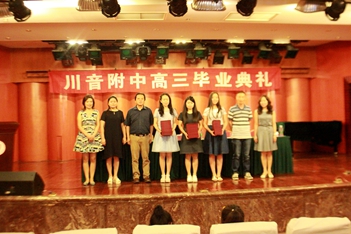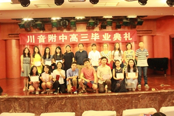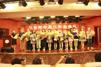 2016年6月12日下午3:00,川音附中高三毕业典礼在聂耳音乐厅隆重举行!蔡宇校长、唐燕翎书记、陈平副校长、何云洪校长助理、高三年级组组长胡瑛老师以及高三的所有老师、同学、部分同学家长参加了本次活动。 首先,蔡校长作了致辞,他谈到:这已经是他送走的第11批毕业生,希望各位同学不论到哪里,都能牢记自己是川音人的身份,创造新的辉煌。随后,刘天赋老师作了风趣幽默的发言,对同学们表达了美好的祝福。学生代表文子洋、家长代表杨湿琦妈妈也分别作了感言,他们都谈到了对老师和学校的感谢,以及对学生时光的不舍和怀念。最后,由唐书记当众宣读了优秀毕业生名单,并为所有同学颁发毕业证。学生代表为老师们送上了鲜花,整个典礼达到了高潮。 典礼结束后,各班分别到聂耳像前合影留念,留下珍贵的记录。