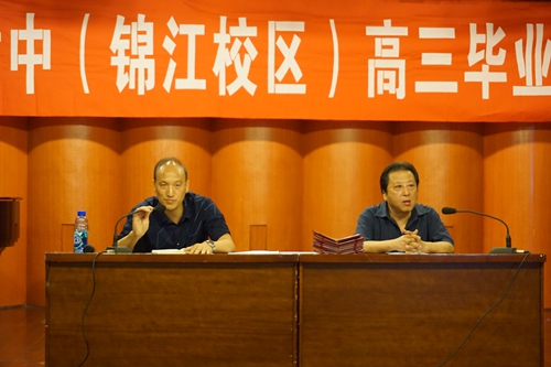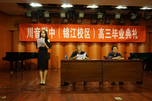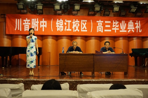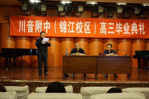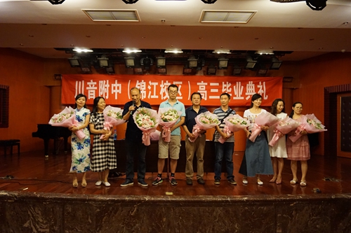 六月十三日下午3:00,高三毕业典礼在聂耳音乐厅隆重举行,蔡校长、高三年级各科任老师及部分家长参加了典礼。 大会由年级组长吴兵法老师主持,毕业典礼在庄严的国歌声中拉开了帷幕,随后学生代表向川一及其家长发言,他们回想着在附中学习生活的点点滴滴,表达了对学校及老师的感激之情。接下来教师代表彭俊老师发言,她回忆高中三年的感动瞬间,送给大家温馨的祝福。最后由蔡校长向全体高三毕业生讲话,蔡校长对大家顺利毕业表示祝贺,要求大家要自信、自律、自强,对同学们提出了的殷切期望。   典礼的最后,由蔡校长宣布张灵等十一位同学荣获附中优秀毕业生并颁发荣誉证书,以及为全体毕业生颁发毕业证书,年级给学校赠送纪念品,同学们为学校领导及老师鲜花表达感恩之情,老师们也为同学们送上了珍贵的离别赠言! 典礼结束后,所有老师及同学在聂耳广场拍摄毕业照片,为高中生活画下了圆满的句号。