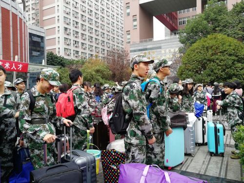 2018年9月15日七点三十分,附中128位参与此次军训的高一同学们在聂耳广场集结出发,前往新都校区,附中唐书记、董老师及其他相关老师前来组织并送行。 这一天的同学们,军装在身,精神抖擞,举手投足之间尽显附中学子昂扬风姿。他们携带着行李,在老师的指挥下以班为单位,整整齐齐地列队登车,向着新都校区出发。 陪同前往新都的是此次军训的带队老师和高一的三位班主任,到达后,在老师的带领下,同学们迅速而有序地列队集合,分配寝室,自行将沉重的行李搬上宿舍楼,上了他们此次军训的第一课。 随后,他们再次集合整队,前往体育场参加军训开训仪式。会上,部队首长、学院领导及学生代表发表讲话,激励同学们刻苦训练、珍惜时间,也提醒同学们要严守纪律、尊重教官,认真、高效、安全、有序地完成此次军训。 仪式结束后,新都附中张书记及军训负责教官给同学们宣布纪律、整顿着装,同学们认真听取要求、正式开始了本次为期14天的军训。