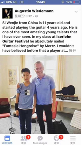 德国时间 2019 年 08 月 09 日 20:40(北京时间 08 月 10 日 02:40),从德国伊瑟隆传来捷报,在2019年第28届德国伊瑟隆(Iserlohn)国际吉他艺术节暨第9届伊瑟隆国际吉他比赛中,川音附中学子囊括了几乎所有的重要奖项。其中,附中初一学生姒文杰、高二学生姒辰禹分别获得12-16岁组第一名和第三名,附中高三学生黄越轩获得17-21岁组第二名(第一名空缺)。这也是继川音学子匡俊宏于2012年在该项赛事中获得第四名以及“最佳巴赫作品诠释奖”和“最佳西班牙作品诠释奖”之后,川音附中学生再次在这个欧洲最高规格的吉他赛事中获奖。