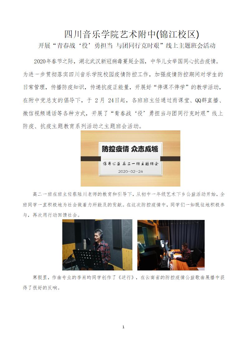 伟德bv国际体育艺术附中(锦江校区) 开展“青春战‘役’勇担当 与团同行克时艰”线上主题班会活动