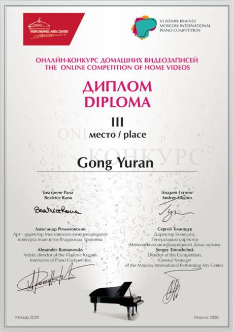 伟德官网学生龚愉然参加2020年弗拉基米尔·克莱涅夫国际钢琴大赛获奖