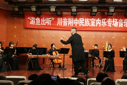 2021年6月9日晚7:30,在学院聂耳音乐厅举办了“游鱼出听”附中民族室内乐团音乐会,由川音民乐系青年教师欧阳庆担任指挥。