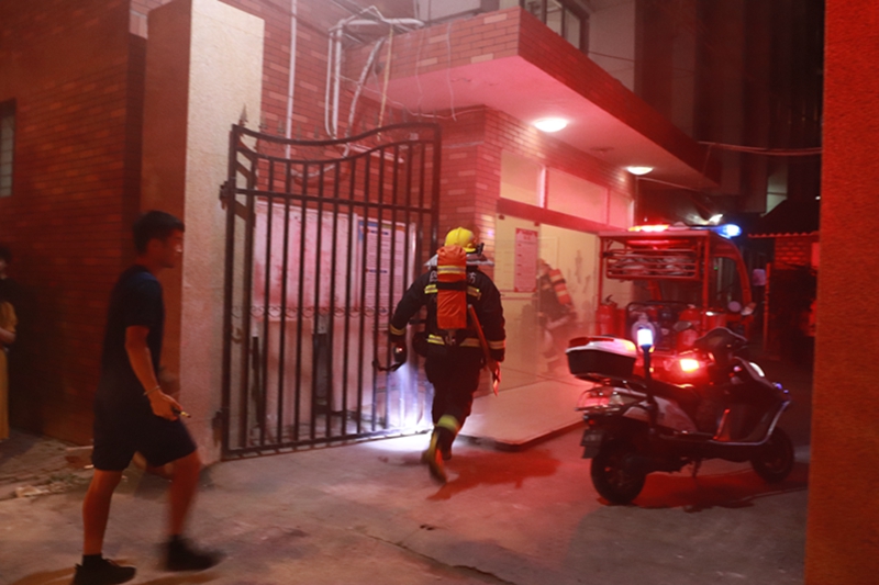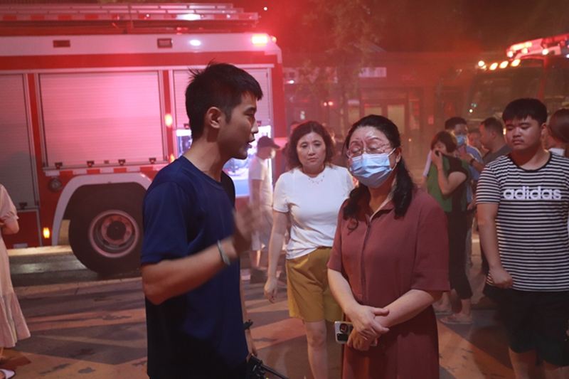 同学们按要求回到寝室,各楼层发出烟雾后在老师的紧急催促和指挥下迅速用毛巾捂住口鼻俯身有序撤离到楼下安全地带,学院消防车第一时间赶到宿舍楼做出火情初步处理,紧接着龙江路消防中队两辆消防车紧急赶到现场,消防员火速跳车冲进宿舍楼,整个演练一气呵成,师生们爆发出热烈的掌声。