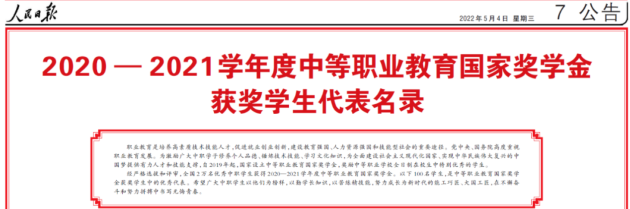 伟德官网高二二班唐云鹤同学,通过严格选拔和评审,被评选为全国优秀中职学生,获得2020—2021学年度中等职业教育国家奖学金,并作为中等职业教育国家奖学金获奖学生优秀代表登上《人民日报》。