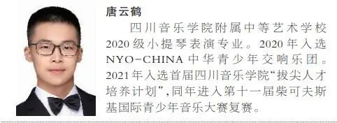 唐云鹤同学自2017年就读附中以来,在努力提高专业水平的同时重视文化课的学习,专业和文化成绩均排名年级前列,每年获得“专业优秀”、“优秀学生”称号。他积极参加学院的大师课、交响乐团、室内乐排练、比赛和演出活动。2019年入选NYO-CHINA中华青少年交响乐团,2021年入选伟德bv国际体育重点拔尖人才培养计划,2021年进入第十一届柴可夫斯基国际青少年音乐大赛复赛。