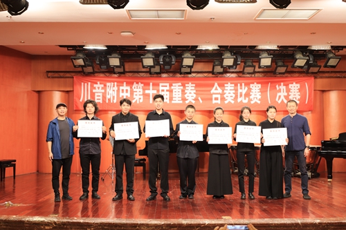 川音附中第十届重奏、合奏比赛决赛于5月23日下午在川音聂耳音乐厅顺利举行,担任本次决赛的评委老师有:焦力教授、张忠教授、李兵教授、徐宝教授、杨云教授、鞠兴副教授、朱曦副教授。从初赛中脱颖而出的六组选手经过一周的努力,向我们展示了更加精彩和完整的演出,并在所有选手演奏结束后,每一位评委老师对所有参赛组做出了细致的点评,在肯定同学们演奏能力的同时,也指出了他们的不足,希望同学们在今后的学习中能够更好的了解自身优势与不足,成为更加优秀的演奏者。