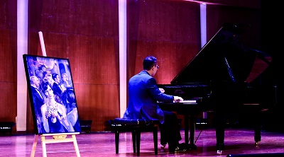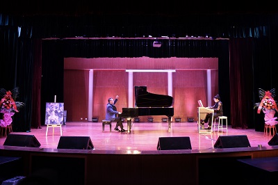 2020年11月10日19点在伟德bv国际体育小音乐厅秦伟老师成功举办了一场“声音与色彩对话”的独具匠心的音乐会。 音乐会由艺术附中表演教师孙博文老师主持。整场共两大曲目部分,分别为俄罗斯作曲家穆索尔斯基的交响套曲《图画展览会》和美国作曲家格什温的代表作——爵士风格钢琴协奏曲《蓝色狂想曲》,中间由手风琴电子键盘系的程璐老师作为嘉宾演奏了阿根廷作曲家皮亚佐拉的探戈作品《遗忘》。 现场还有艺术家罗维林女士为此台音乐会所创作的两幅油画作品,分别为《图画展览会》之《女巫》和《蓝色狂想曲》,尝试让现场的听众搭配两幅作品使音乐与绘画相融合,听觉艺术与视觉艺术相贯通。