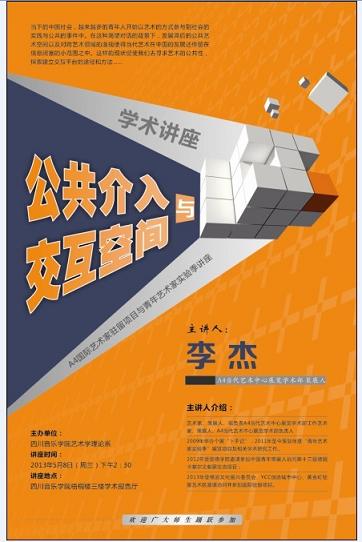 2013年5月8日下午,伟德bv国际体育艺术学理论系邀请了A4当代艺术中心展览学术部负责人李杰为我系学生及学院广大师生进行交流与讨论。在近三个小时的讲座中,李杰为我们带来了精彩纷呈、高潮迭起的演讲,并对当下同学们在学习与实践中的各式提问进行了解答与建议。本次讲座内容涉及到公共艺术管理和文化产业,以案例分析为主,涉及跨国际的交流活动与实验策划等,令同学们如沐春风。