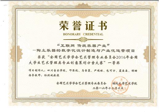此次学术活动还举办了“2016全国艺术管理类学生创意大赛”,艺术学理论系邓思杭所策划的《“互联网+传统乐器产业”——陶土乐器的数字化设计制造与产业化运营》项目获得全国“一等奖”,项目导师孙洪斌教授获评为“优秀指导教师”。该项目作为四川省唯一入选项目,在大赛的专家盲评阶段获得了全国最高分,创造了川音在艺术管理及创新创业相关大赛中的最好成绩,进一步证明了川音在相关专业领域的雄厚实力,也充分展示了我院学子“敢于突破,勇于创新”的川音精神。