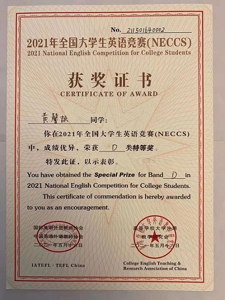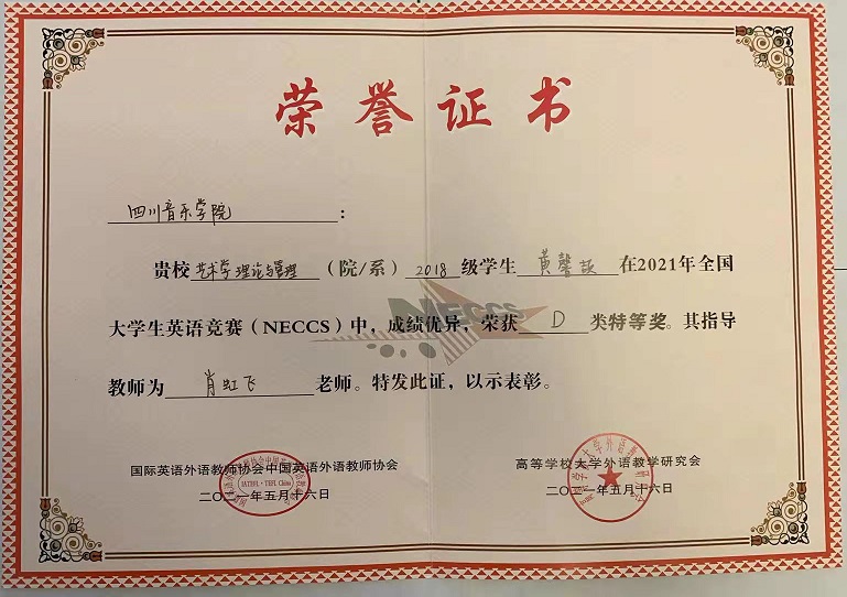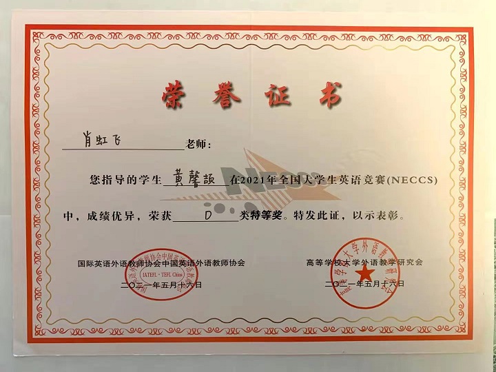 近日,全国大学生英语竞赛(2021 National English Contest for College Students, 简称 NECCS)决赛落下帷幕。由我院肖虹飞老师指导的黄馨颉同学发挥出色,以110分的优异成绩荣获决赛特等奖。此次竞赛分初赛和决赛,我院共有十几名同学参加初赛,初赛中黄馨颉同学崭露头角,荣获第一名,并代表我院参加决赛。伟德bv国际体育共2人参加了竞赛D类(艺术专业)决赛。在决赛过程中,黄馨颉同学以自身过硬的专业素养和能力脱颖而出,最终代表伟德bv国际体育闯入决赛并取得良好成绩。大赛后,主办方分别为我院、指导老师和获奖同学颁发了荣誉证书。此次黄馨颉同学荣获决赛特等奖更是对我院英语教师教学业绩、大学生英语学业水平和综合能力运用优异的有力证明。