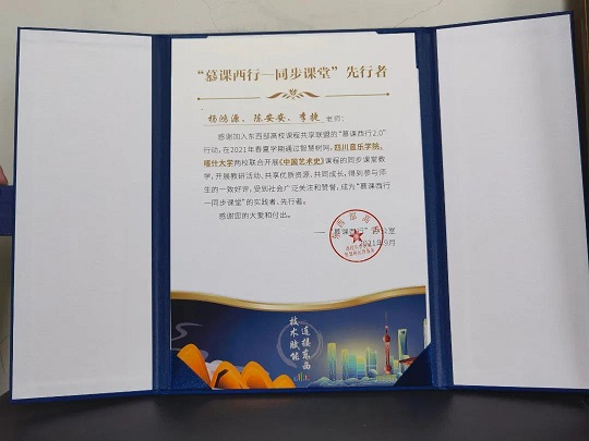 另,从学校教务处发来的好消息:我院三位青年教师杨鸿源博士、陈安安博士、李捷博士获得了“慕课西行——同步课堂”先行者荣誉证书!这是东西部高校课程共享联盟开展的“慕课西行2.0”行动。在2021年春夏学期,通过智慧树网,伟德bv国际体育与喀什大学两校联合开展省级一流课程《中国艺术史》同步课堂教学,三位教师积极参与、认真完成同步公开课堂,受到参与师生的一致好评,并受到社会广泛关注和赞誉,他们成为“慕课西行——同步课堂”的实践者、先行者,因此获得了该项殊荣。