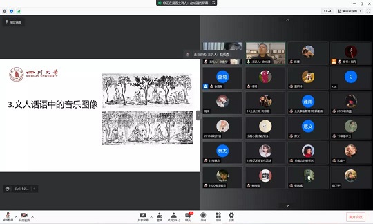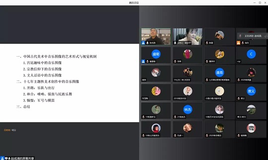 赵成清副教授首先引用习近平总书记关于中华传统文化的讲话精神,提出中华文化的核心是礼乐文化,从而深化音乐元素在艺术创作中的重要性。他从宫廷趣味中的音乐图像、宗教信仰下的音乐图像、文人话语中的音乐图像三个维度带领大家回顾分析了中国古代绘画作品中乐器演奏的场景以及音乐元素的运用,提出了“观图辨乐”的可行性思考,并为新中国成立后主题美术创作同古代美术作品的音乐图像转译埋下伏笔。