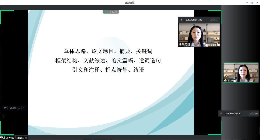 刘弋枫老师详尽讲述了论文写作中的十一个要点,分别是总体选题思路、论文题目、摘要、关键字、框架结构、文献综述、论文篇幅及材料搜集、遣词造句、引文和注释、标点符号、结语。