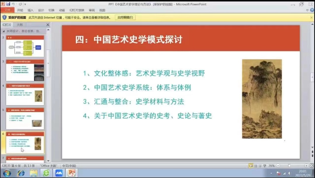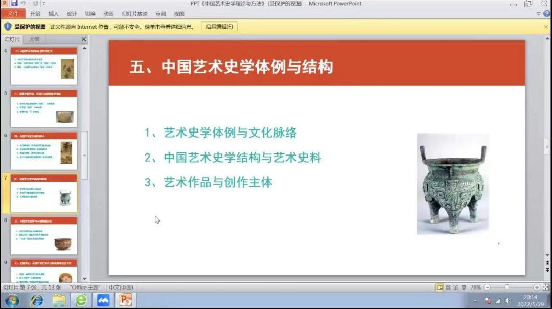 归纳起来,李倍雷教授的讲座,集中体现出十大观点:一是中国艺术史的形状应该是一个“汇通”的概念,即在各门类艺术史和文人艺术史、宗教艺术史、宫廷艺术史、民间艺术史四个板块基础上进行整体、宏观研究所有史料的汇通,而不是简单的跨学科相加,是1+1大于2;二是中国艺术史应该是以中国艺术史料为中心、以中国传统思想文化为路径的、反映中国人内心世界的艺术史;三是艺术史的时空观是指在围绕作品为中心的艺术变迁时间轴上、把相近的艺术史料各空间点在整体文化逻辑上连接起来形成艺术史的形状;四是特定历史环境中艺术的发生发展和演变构成“史境”,其中“人”的因素包括“在场”和“不在场”的;五是必须树立中国大历史观和中国文化整体感,艺术史不过是其中的“专门史”、“小支流”;六是艺术史学体例结构应包含五个要素:艺术作品、艺术家、艺术文献、史境以及贯穿所有的文化逻辑;七是中国艺术史必然体现儒家主体、道家本体的中国传统文化精神;八是由艺术史料而展现的从礼仪、教化到意象、意境等,体现着中国艺术史变迁的史学价值与意义;九是丰富多彩的民间艺术构成了艺术史的多层结构,使艺术史更加完整,更加系统;十是中国艺术史的研究应该充分体现“意境”这一中国艺术审美的最高境界。