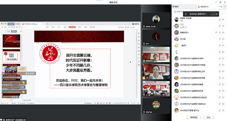 9月的蓉城,阳光和煦,丹桂飘香,又到了收获的季节。在疫情防控的特殊时期,艺术学理论与管理举行了一次别开生面的“云端”开学典礼。2022级全体新生(含研究生、本科生、第二学士学位生、专升本生)共218名,于9月21日中午相聚在腾讯会议云端。我院全体领导班子成员、行政工作人员、班主任等参加了开学见面会。