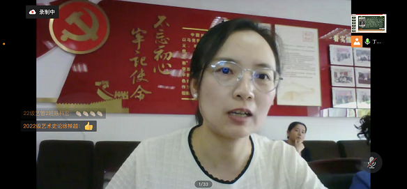 吕思雨老师作为辅导员代表寄语新生同学们。吕老师为同学们介绍了目前线上教学的要求与注意事项,以及学生寝室的相关规定。吕老师也鼓励同学们根据个人兴趣与特长选择加入学生会或川音IDEA惠风创意学会。
