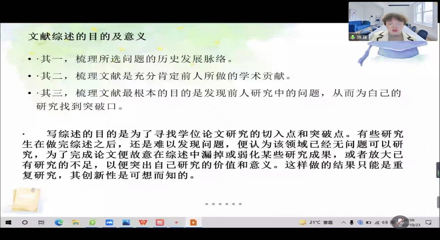 之后,陈老师又对文献综述的难点——“述”提供了一些解决方法。同时对文献综述的五个方面的要求以及研究的意义和价值进行了说明,强调文献综述就是让人们在收集资料时更加高效,能够更加精准的标记到自己所需要的信息。