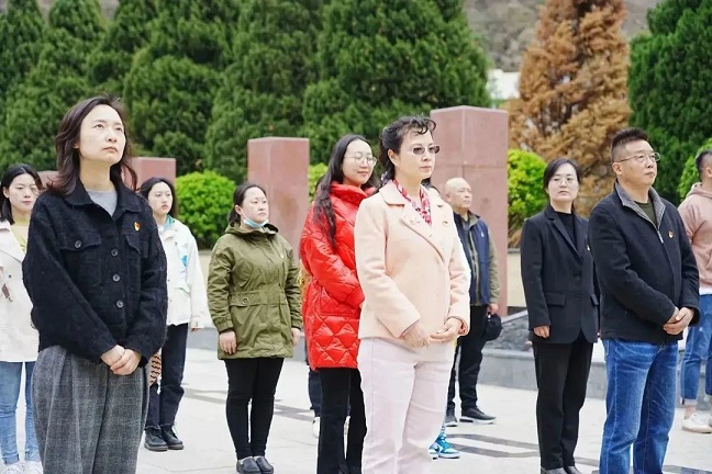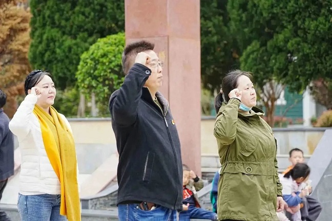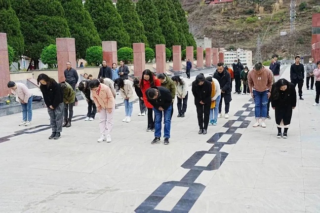 全体师生代表站在烈士碑的前,一起行三次鞠躬,向英烈们深深地鞠躬,表达对先烈深深的敬意。