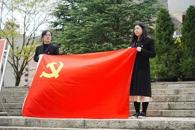 鞠躬仪式结束后,党员代表再次站齐,在学院党委书记、院长赵崇华同志带领下,庄重地向着鲜艳的党旗注目,右手握拳,庄严宣誓,重温入党誓词。入党誓词的庄严声音在空旷的广场中回响。